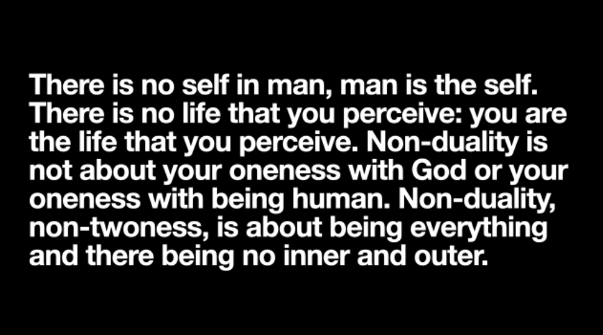 There is no self in man, man is the self. There is no life that you perceive: you are the life that you perceive. Non-duality is not about your oneness with God or your oneness with being human. Non-duality, non-twoness, is about being everything and there being no inner and outer.